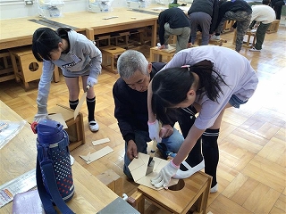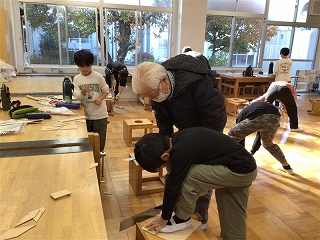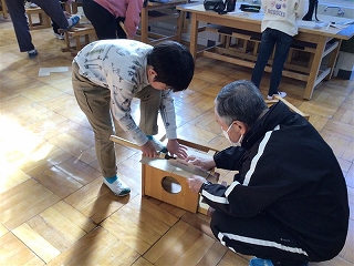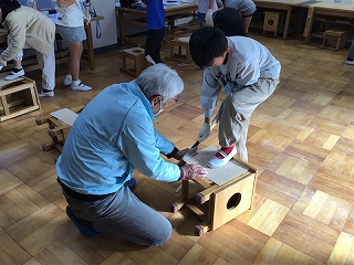 今日は、地域の先生方がのこぎりの使い方を教えに来てくださいました。
