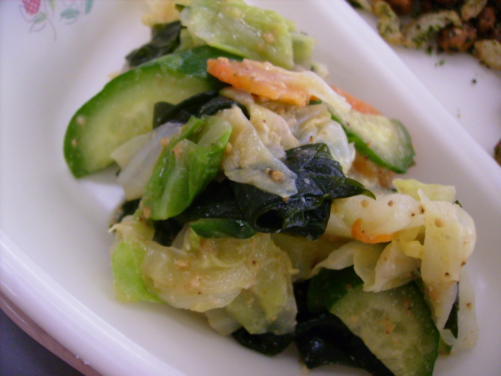 温野菜味噌ドレッシングは、わかめ、キャベツ、きゅうり、 にんじんが入り、すりごま、味噌、酢、サラダ油、さとうで 手作りしたドレッシングで和えました。