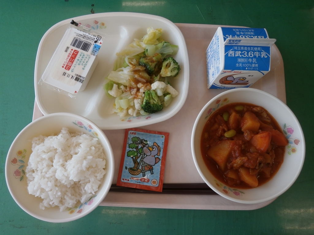 牛乳、ごはん、肉じゃがのトマト煮 冷や奴、花野菜サラダ、ふりかけ今日は運動会の疲れを癒やす、疲労回復メニューにしました。 肉じゃがには、トマトにはビタミンCがたっぷり含まれ、 にんにくも食欲増進させる、いい香りがしました。 今日は暑かったので、冷えていてさっぱりとした冷や奴と サラダが人気でした。肉じゃがも、トマトの酸味と甘みがいい感じに 出ていておいしく仕上がりました。 |