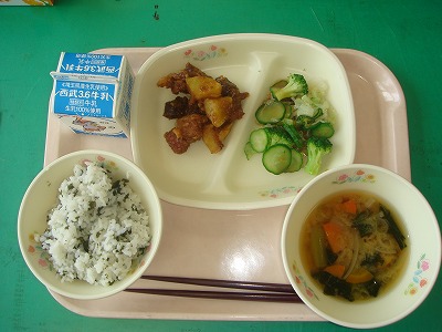 9月5日(月)の給食☆本日の献立☆ わかめご飯、豚肉とレバーのごまだれ、グリーンサラダ、玉ねぎのみそ汁 ごまだれのおかげで、レバーが苦手な子もだべられそうです。 |