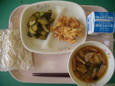 9月15日(金)の給食☆本日の献立☆ 地粉うどん、肉汁うどんの汁、かき揚げ、キュウリのピリッと漬け かき揚げにさつまいもの細切りが入っていて、ほんのり甘く、うどんの汁とよく合っていました。 |