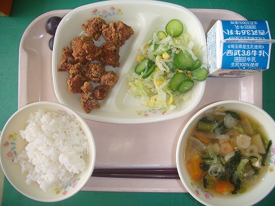 9月11日(月)の給食☆本日の献立☆ ご飯、カツオのカリカリ揚げ、三色サラダ、吉野汁、巨峰 今日は、三色サラダに加えて、吉野汁にも野菜がたっぷり入っていて、体の調子を整えるのによい献立でした。運動会を前に、疲れ気味の体にちょうどよかったと思います。 なお、予定献立表には「わかめご飯」とありましたが、都合で、普通の白米に変更になりました。 |