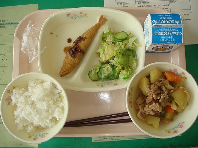 5月11日(水)の給食☆今日の献立☆ ご飯、肉じゃが、ししゃもフライ、キャベツとキュウリのサラダ ジャガイモもほくほく、味もしっかり、おいしい肉じゃがです。 |