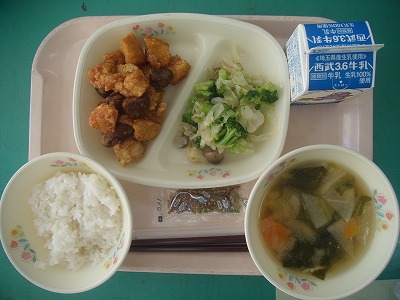 10月22日(月)の給食☆本日の献立☆ ご飯、ふりかけ、鶏肉とレバーのレモン煮、香味サラダ、みそ汁 ブロッコリーやカリフラワーと一緒に、シメジも入ったサラダ、とてもおいしかったです。レモン煮も、甘い中にもレモン風味が感じられて、おいしかったです。 |