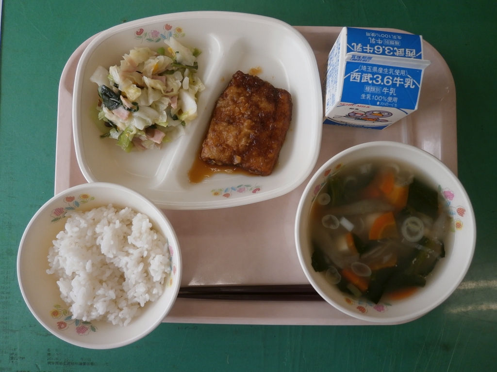 牛乳、ごはん、さんまのかば焼き 青菜ときのこのソテー、お月見汁
