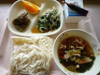 (メニュー) 肉うどん ちくわの煎茶揚げ 大根とジャコのサラダ
