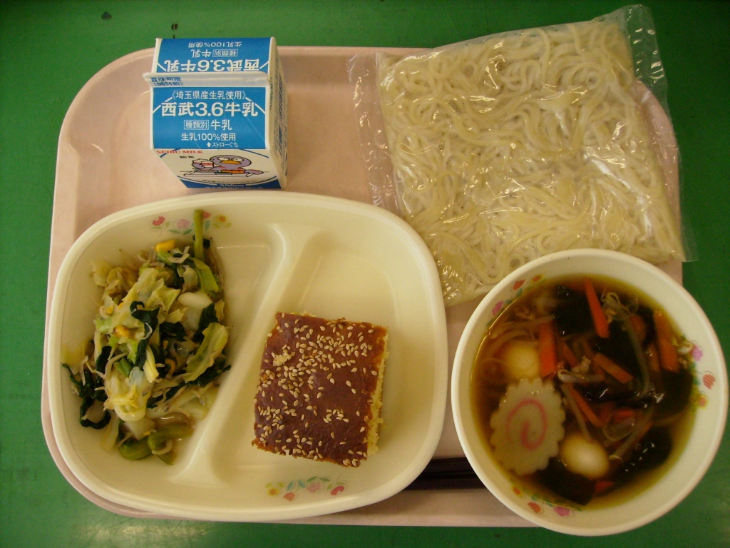 ☆今日の献立☆  牛乳、しょうゆラーメン ごまおさつパンケーキ、小松菜のじゃこの炒り煮 ごまおさつパンケーキは、今月の新メニューでした。 角切りにしたさつまいもと、すりごまを生地に混ぜて 鉄板に流しいれてから、いりごまを上からふって オーブンでこんがりと焼きました。 胡麻のいい香りがよく、さつまいもも甘くておいしかったです。 しょうゆラーメンには、野菜がたくさん入り 野菜のうまみが出ていておいしかったです。 じゃこの炒り煮も好評でした。 |