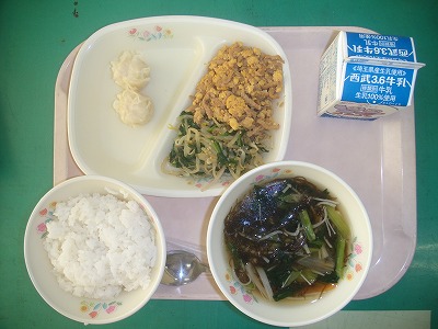 11月9日(木)の給食☆本日の献立☆ ご飯、ビビンバの具、蒸しシュウマイ、もずくスープ ビビンバの具をご飯に混ぜて食べると、ちょうどよい味になって、とてもおいしいです。蒸しシュウマイもふっくら蒸し上がっていておいしかったです。 |