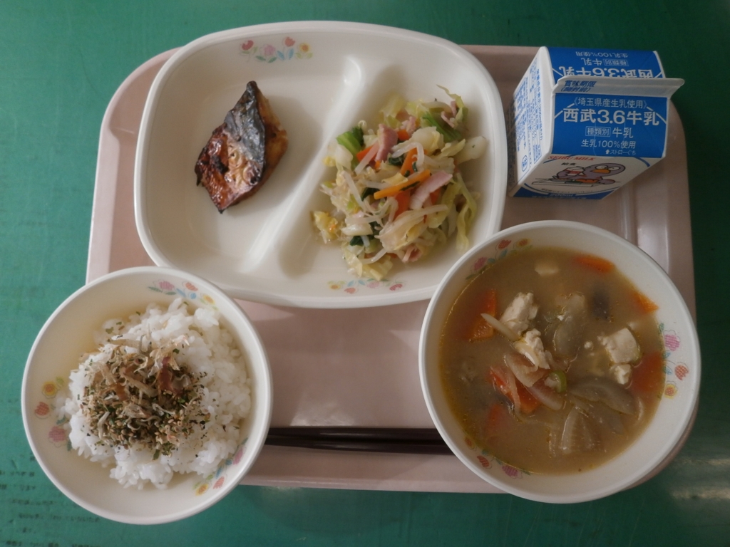 ☆今日の献立☆ 牛乳、ご飯、せん茶入り手作りふりかけ、豚汁 さばの生姜焼き、野菜炒め