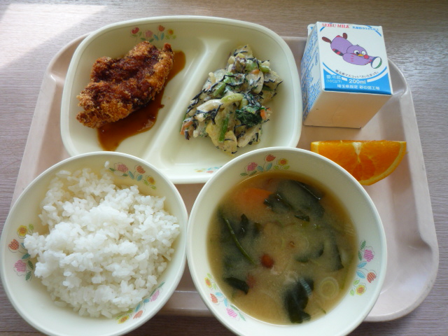 (献立) ソースカツ丼 彩の国サラダ なめこ汁 オレンジ 牛乳 (コメント) 鶏肉には厚みがありました。 彩の国サラダには埼玉県産のサツマイモが使われています。 とても食べやすいサラダです。 |