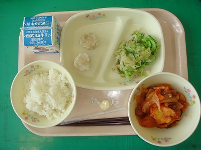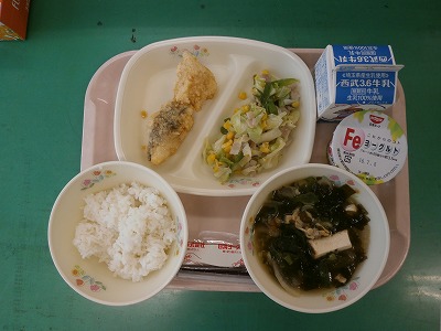 6月24日(金)・27日(月)の給食☆6月24日(金)の献立☆ ご飯、白身魚のレモン風味あげ、野菜ソテー、みそ汁、フルーツヨーグルト ☆6月27日(月)の献立☆ ご飯、酢豚、エビシュウマイ、キュウリ・キャベツのドレッシング和え、チーズ |