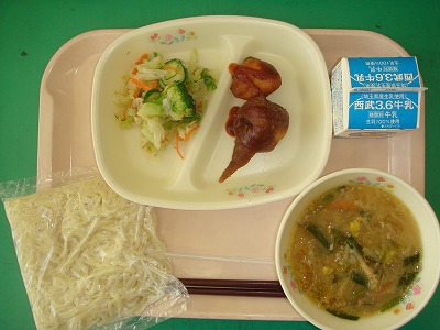 1月25日(水)の給食☆本日の献立☆ ラーメン、胡麻味噌ラーメンの汁、ポテトドック、セサミサラダ 胡麻味噌ラーメンにセサミサラダ。今日は胡麻特集のようです。胡麻は香りもよく、食欲も刺激します。お腹いっぱい食べたでしょうか? |