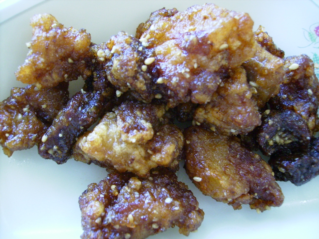 豚肉とレバーのごまだれは、豚もも肉の角切りにしょうが、 酒、しょうゆで下味をして、片栗粉をまぶして揚げます。 レバーは、血抜きして、さっと茹で、同じように下味をして、 片栗粉をまぶして揚げます。 それを、砂糖、しょうゆ、みりん、水を煮立てて作ったタレと 最後に香ばしいすりごまを一緒に和えました。 レバーは唐揚げにすると、食べやすくなります。 不足がちな、鉄分を補給できるメニューです。