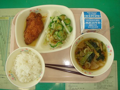 5月16日(月)の給食☆今日の献立☆ ご飯、チキンカツ、キャベツとキュウリのサラダ、なめこ汁 カツはからっと揚がっていて、たれもご飯に合ういい味です。 |