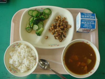 6月29日(水)の給食☆本日の献立☆ ご飯、チキンカレー、大豆とゴボウのかりかり揚げ、ブロッコリーとキュウリのドレッシング かみかみ給食の仕上げは、大豆とゴボウのかりかり揚げ。かりかり揚がっていて、しかもかみ応えがあります。チキンカレーもコクがあっておいしく食べられました。 |