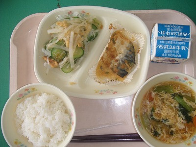 10月18日(水)の給食☆本日の献立☆ ご飯、サバのネギミソ焼、ぱりぱりサラダ、かき玉汁 深谷名物のネギと味噌の相性抜群でした。サバの苦手な子も、きっと食べられたと思います。 |