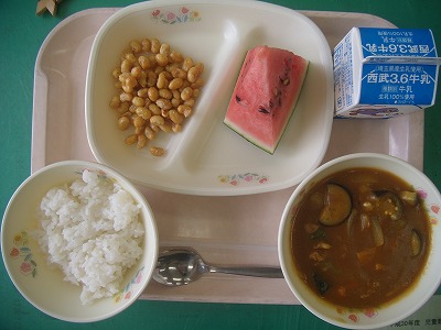 7月13日(金)の給食☆本日の献立☆ ご飯、夏野菜カレー、大豆のカリカリ揚げ、スイカ 大豆のカリカリ揚げは、大豆がふっくらと揚がっていて、もちもちと肉のような食感でした。カリッとしているのもいいですが、こういう感じもおいしいです。 |
