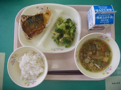 10月26日(金)の給食☆本日の献立☆ ご飯、サバのねぎ味噌焼、ブロッコリーのピリッと漬け、けんちん汁 今、サバがブームで、さば缶が不足しているそうです。今日のサバは、ねぎみその足がしっかりついていて、中はふっくらと…おいしく焼き上がっていました。 |