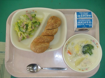 1月15日(火)の給食☆本日の献立☆ 黒ごまきなこあげパン、ハムのマリネ、冬野菜のクリームシチュー 今日はずっと曇りで、気温も上がらず、子どもたちも寒い、寒いと言っています。そんな日にクリームシチューはぴったりでした。野菜もたっぷりで、芯から温まりました。 |