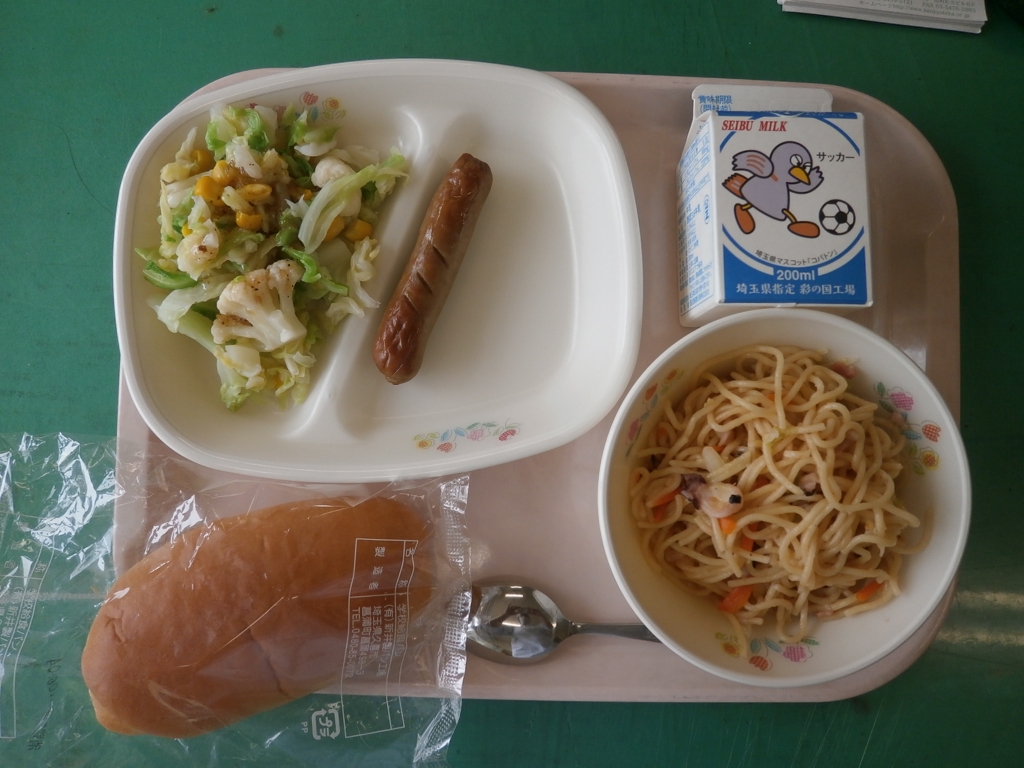☆今日の献立☆  牛乳 たまごパン たこのペペロンチーノ 焼きウィンナー 三色サラダ 今日のたこのペペロンチーノは今月の新メニューです。 たこのほか、あさり、ベーコンなども入りました。 今週は歯の衛生週間ということで、 いつもよりかみごたえのある食材を使うようにしています。