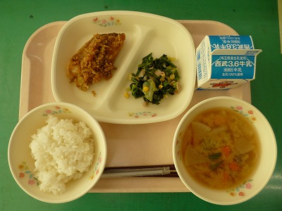 12月8日(木)の給食☆本日の献立☆ ご飯、白身魚の南蛮漬け、ほうれん草ソテー、やさいわん |