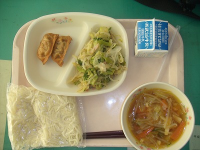 1月12日(金)の給食☆本日の献立☆ 中華麺、サンマーメンの汁、揚げ餃子、ブロッコリーとネギのナムル、チーズ サンマーメンにも野菜がたっぷり、ナムルもネギとブロッコリー。冬でも野菜がたくさん食べられるのは、嬉しいです。 |