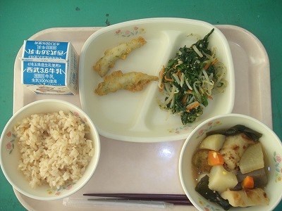 1月15日(月)の給食☆本日の献立☆ 茶飯、おでん、ワカサギフリッター、ほうれん草の胡麻酢和え 先週の終わりから、今週にかけて厳しい寒さが続いています。氷がはるほどの冷え込みです。そんな日には、温かいおでんが嬉しいですね。 |