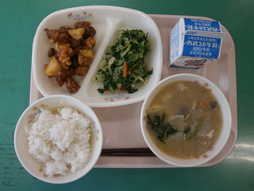 牛乳、ごはん、味噌けんちん汁 豚肉の香味揚げ、おひたし