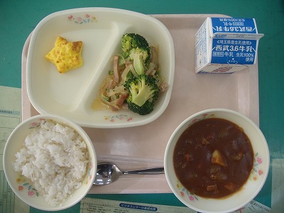 2月8日(金)の給食☆本日の献立☆ ご飯、ハヤシライスのルー、星オムレツ、ブロッコリーと大根のサラダ ハヤシライスは、ジャガイモがごろっと入っていて、コクもあり、ちょうどよい味でした。ご飯をいっぱいおかわりしたでしょうね。 |