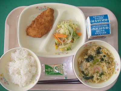9月20日(水)の給食☆本日の献立☆ ご飯、あじフライ、野菜炒め、かき玉汁、タルタルソース 旧学童跡の畑で、はんの木学級の子ども達とブロッコリーの苗植えをしていました。風向きが変わり、フライを揚げているおいしそうなにおいが畑まで漂ってきました。あじフライは、いつもどおり、カリッと揚がっていて、とてもおいしかったです。 |
